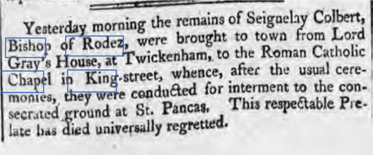 » Seignelay est le troisième fils de George de Castle Hill. Il fut appelé en France dès son jeune âge par ses oncles et entra dans l’état ecclésiastique. Il fut pendant plusieurs années Grand Vicaire de Toulouse, avant d’être choisi en 1781 pour occuper l’Évêché de Rodez, l’un des premiers sièges de ce royaume parmi les Evêchés. Il jouit de cette haute fonction jusqu’à ce qu’en 1792, la Révolution française disperse l’Église gallicane et bannisse du royaume tout évêque qui refusait de se parjurer par des serments déshonorants et honteux. Seignelay Cuthbert, évêque de Rodez, est resté fidèle à ses principes de loyauté et de religion et, à ce titre, a été victime avec beaucoup d’autres de la Proscription générale. Il s’est réfugié en Angleterre et a trouvé asile chez son frère, le quatrième fils de George de Castle Hill .. C’est de la maison de Lewis et depuis sa mort, qui a eu lieu le 29 octobre 1802, que moi, Seignelay Ev. de Rodez, vous écris Monsieur, pour vous donner une connaissance plus adéquate de l’état actuel de vos proches dans diverses parties du globe… «